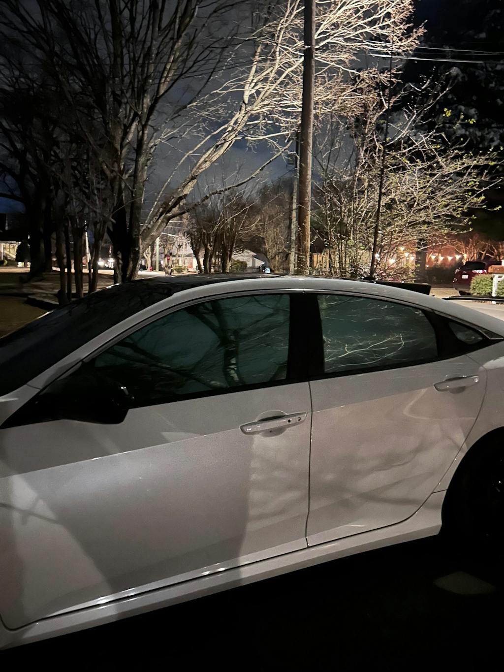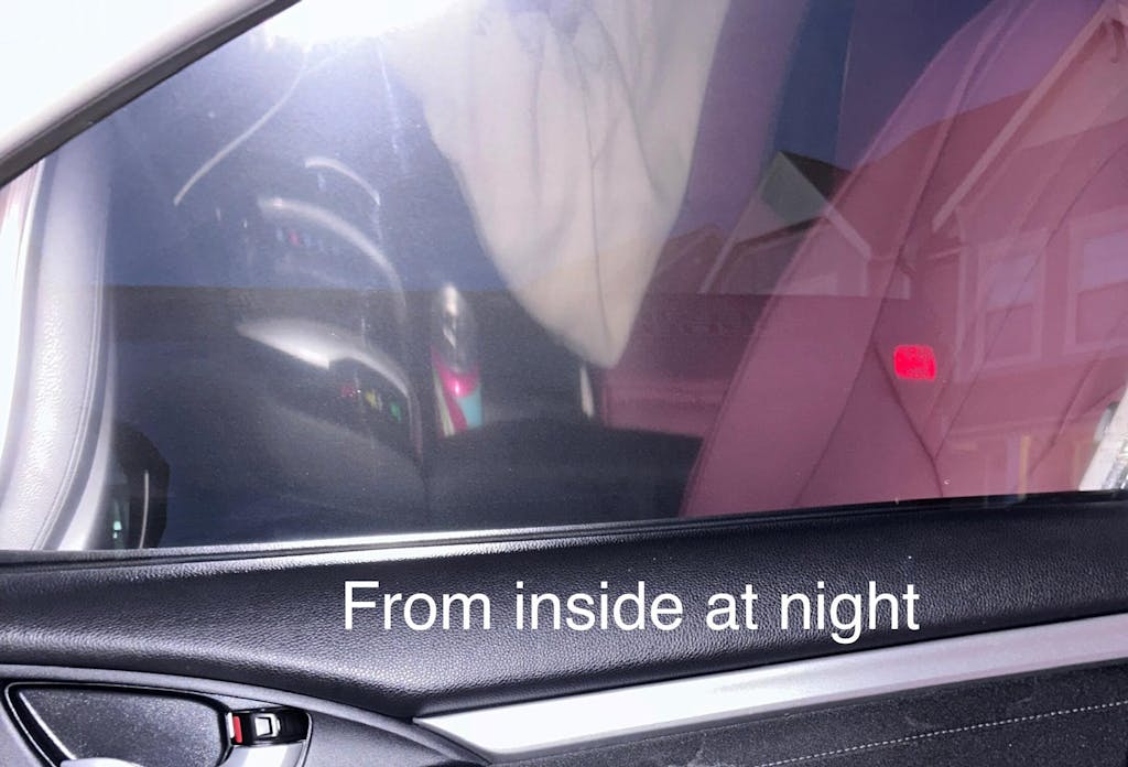 It really does look great. It pretty much looks green/blue on my 2019 civic, but I don’t mind it since I was considering the green instead. My wrap guy wasn’t able to do the front windshield because the heat gun burnt through it right away, so be careful with that. There is a glare when driving at night when it comes to others headlights or street lights. Otherwise, it looks clear (from the inside) during the day! On the outside during the day, it looks like a mirror like I wanted! So far, I’ve only had one cop behind (then next to) me and they didn’t bother me, so that’s a good sign lol.